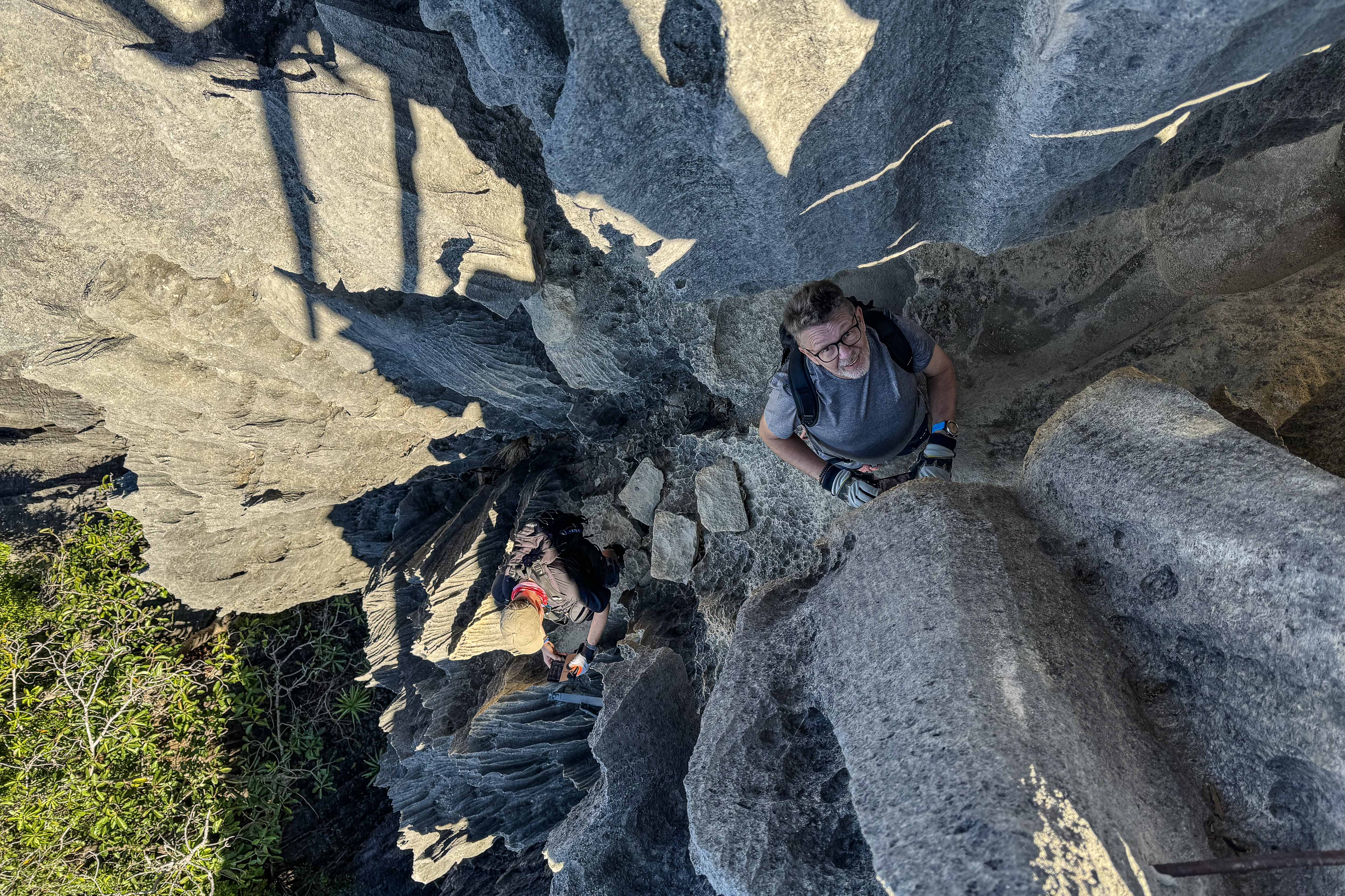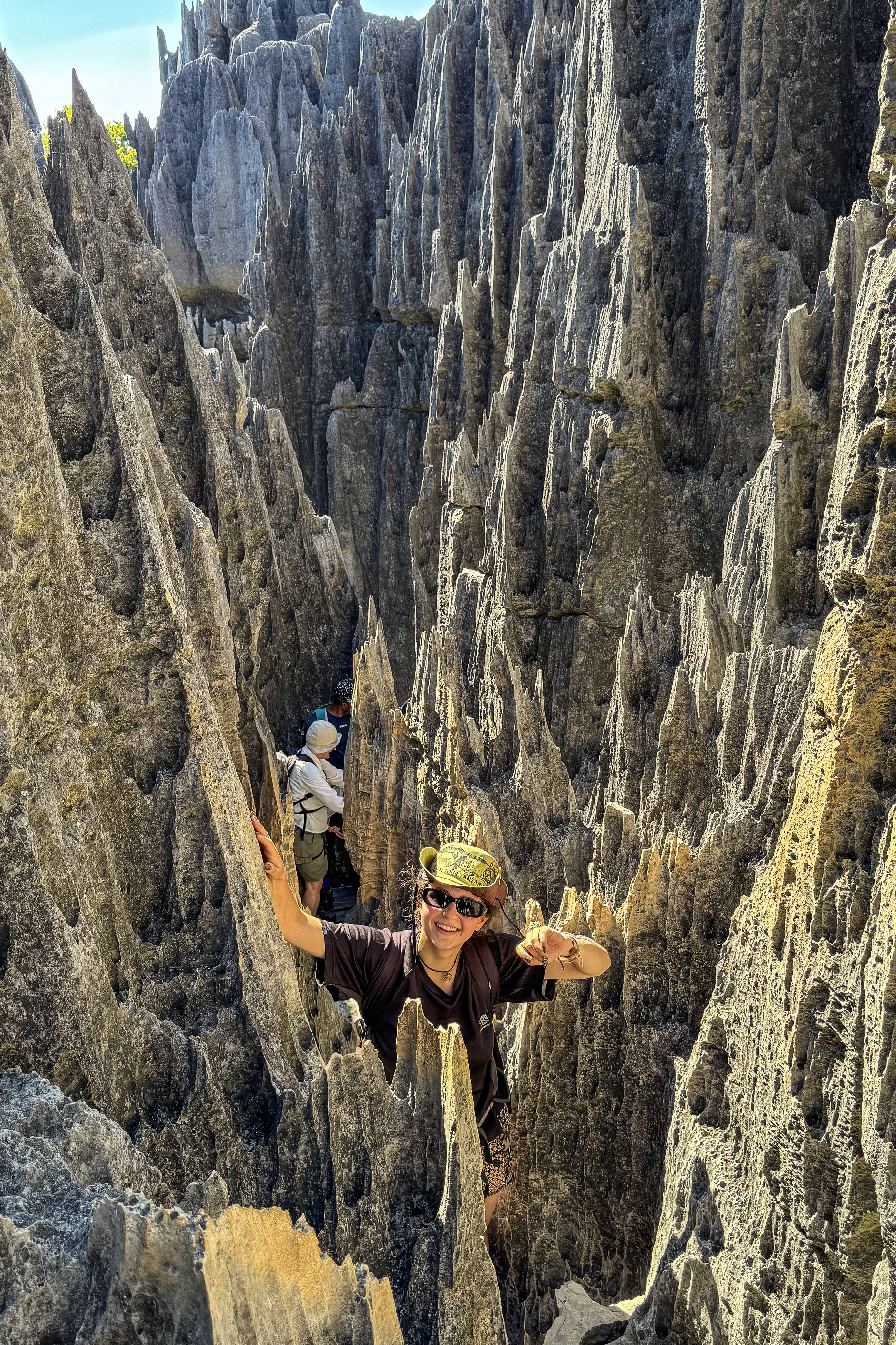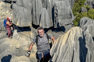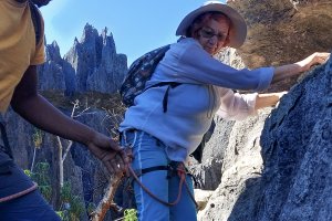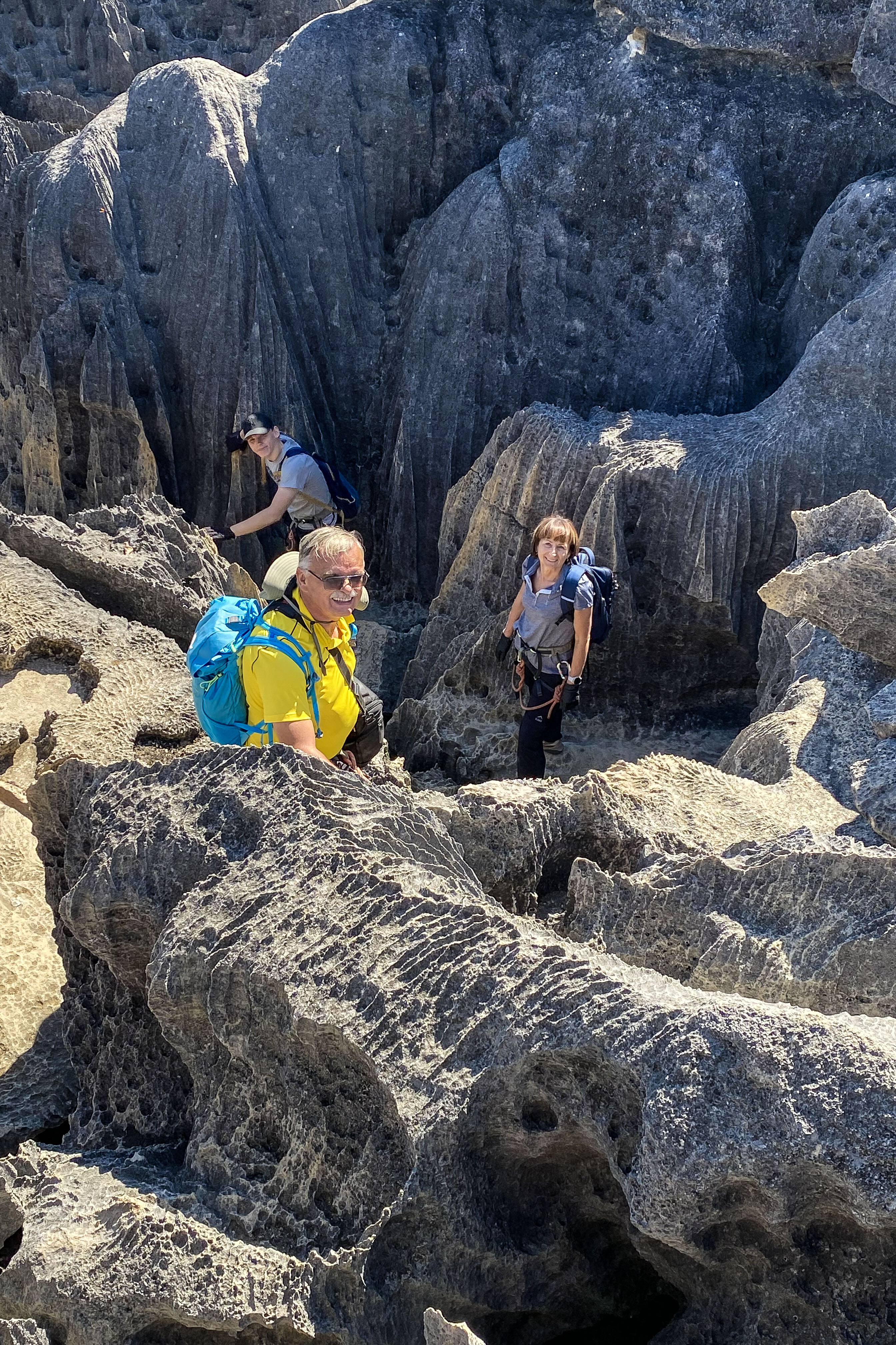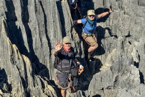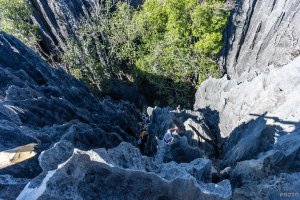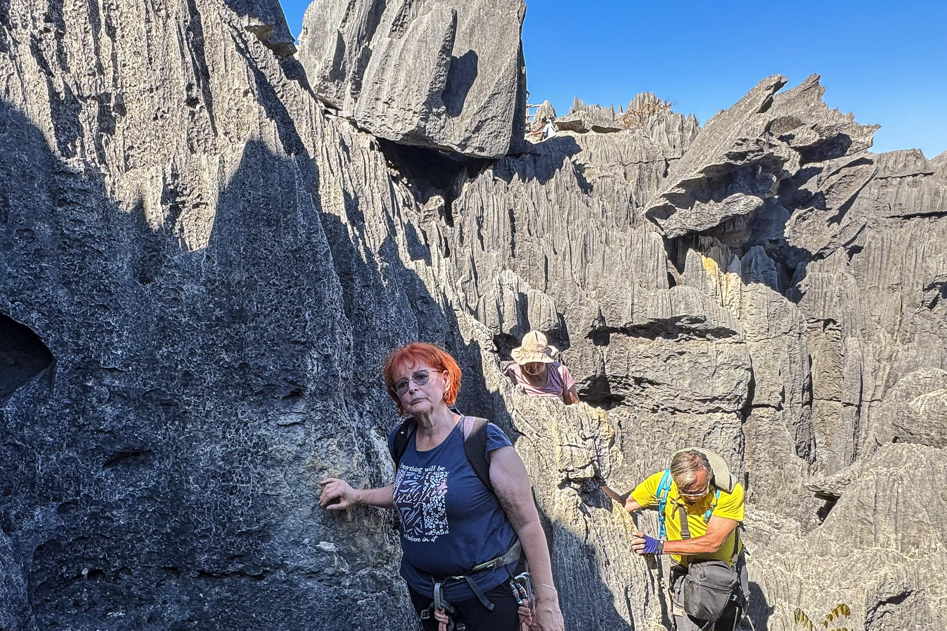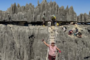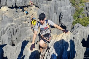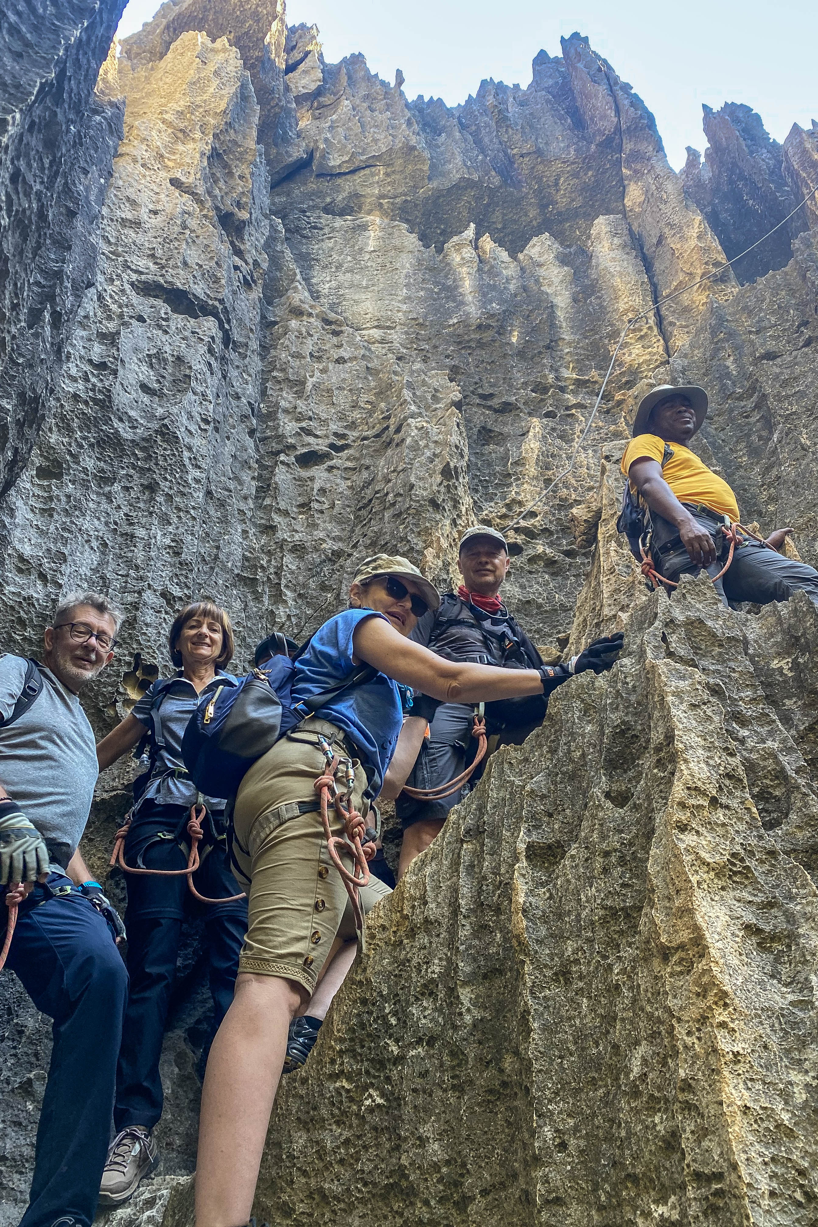Do wejścia do parku mieliśmy z hotelu 17 km, ale po tamtejszych drogach dojazd zajął nam półtorej godziny. Nieco wytrzęsieni dotarliśmy do miejsca skąd startuje szlak na Grand Tsingy. Tam trzeba było założyć uprzęże i lonże bo czekała nas wspinaczka po stromych skałach, po których poprowadzono ubezpieczony szlak. Szlak rzeczywiście był niesamowity, a widoki z najwyżej dostępnych punktów to kolejne niesamowite przeżycie. W zależności od pory dnia i intensywności słońca mieszają się tu wszystkie odcienie szarości i zieleni. Skały obserwowane z dołu sprawiają wrażenie sięgających do samego nieba gotyckich katedr.