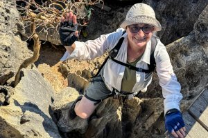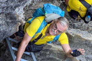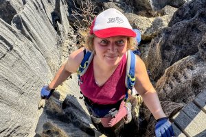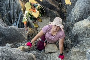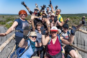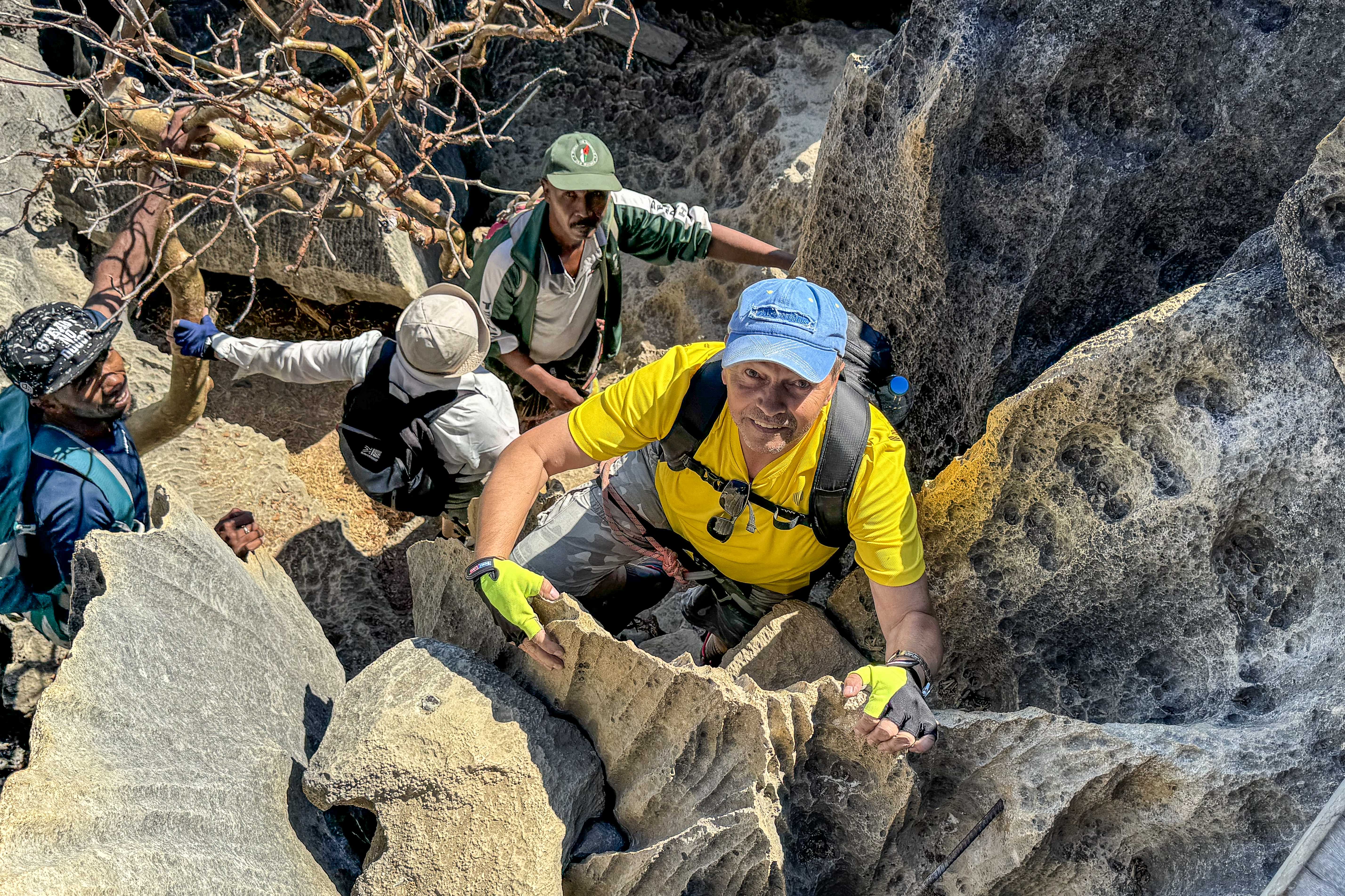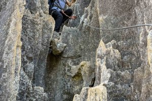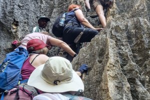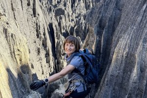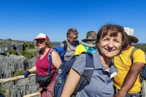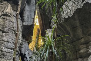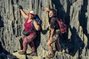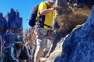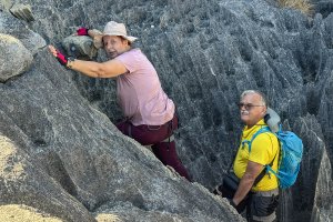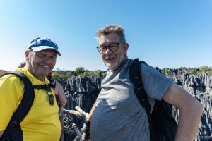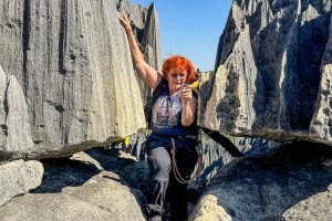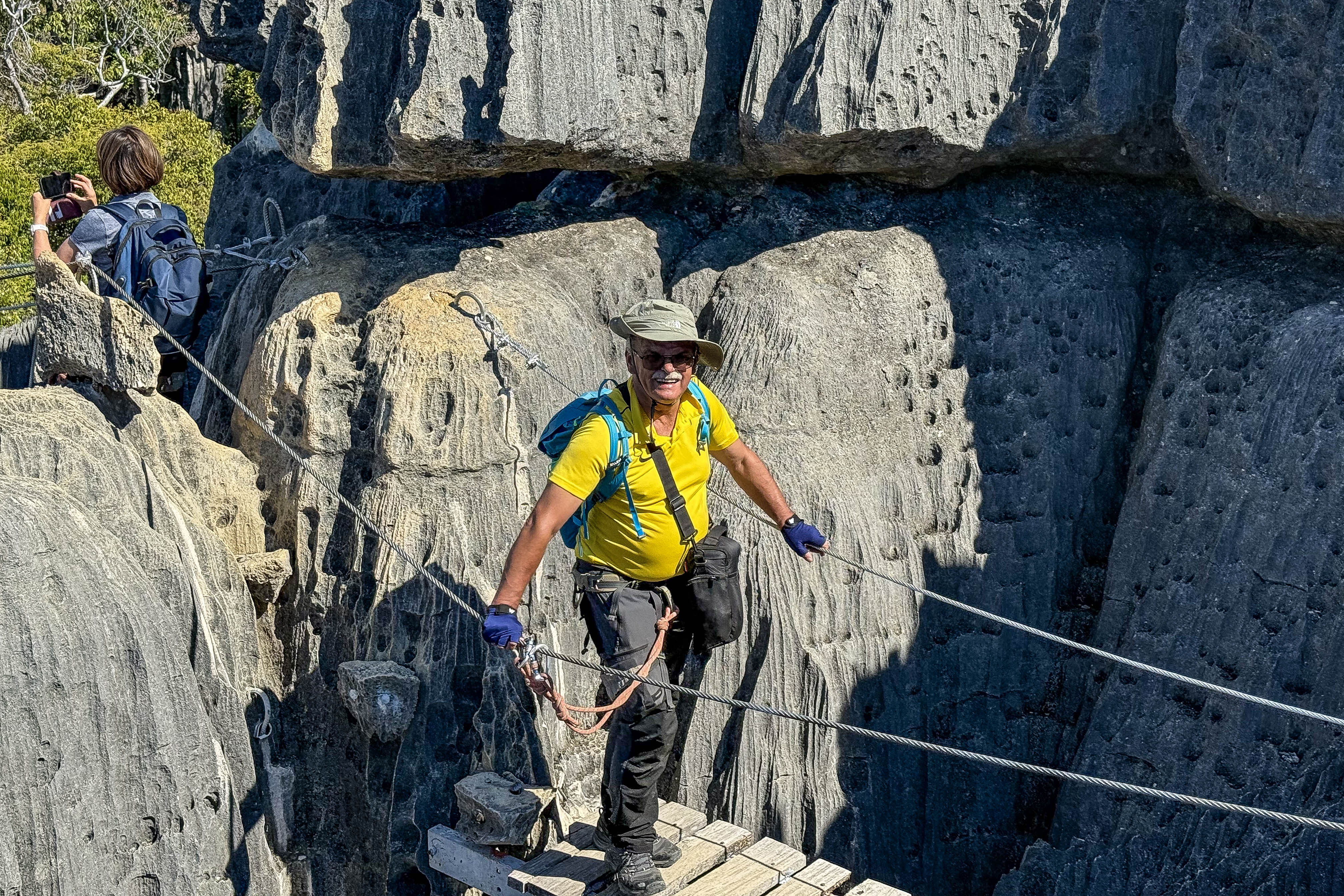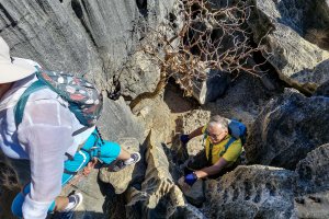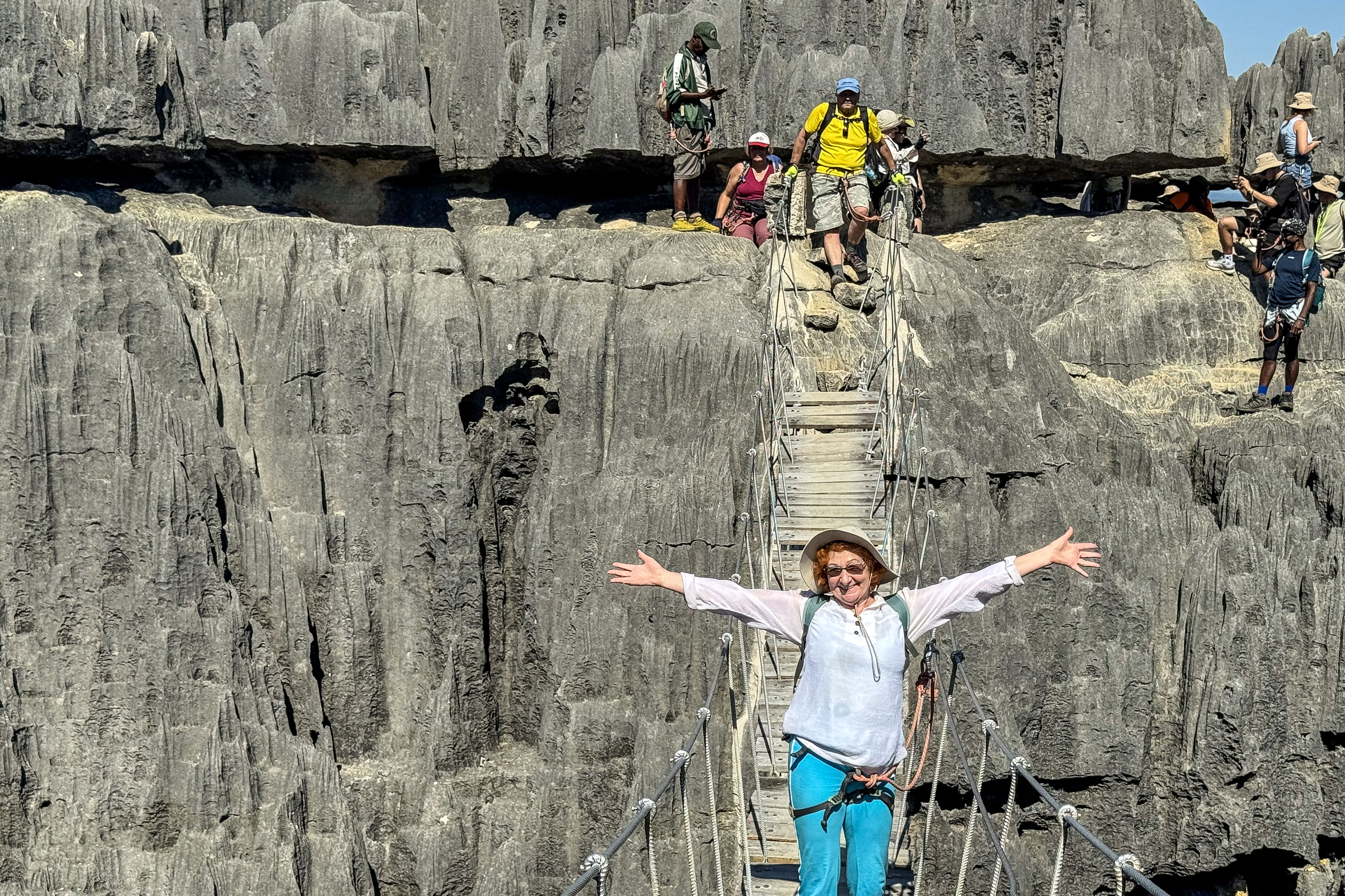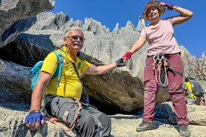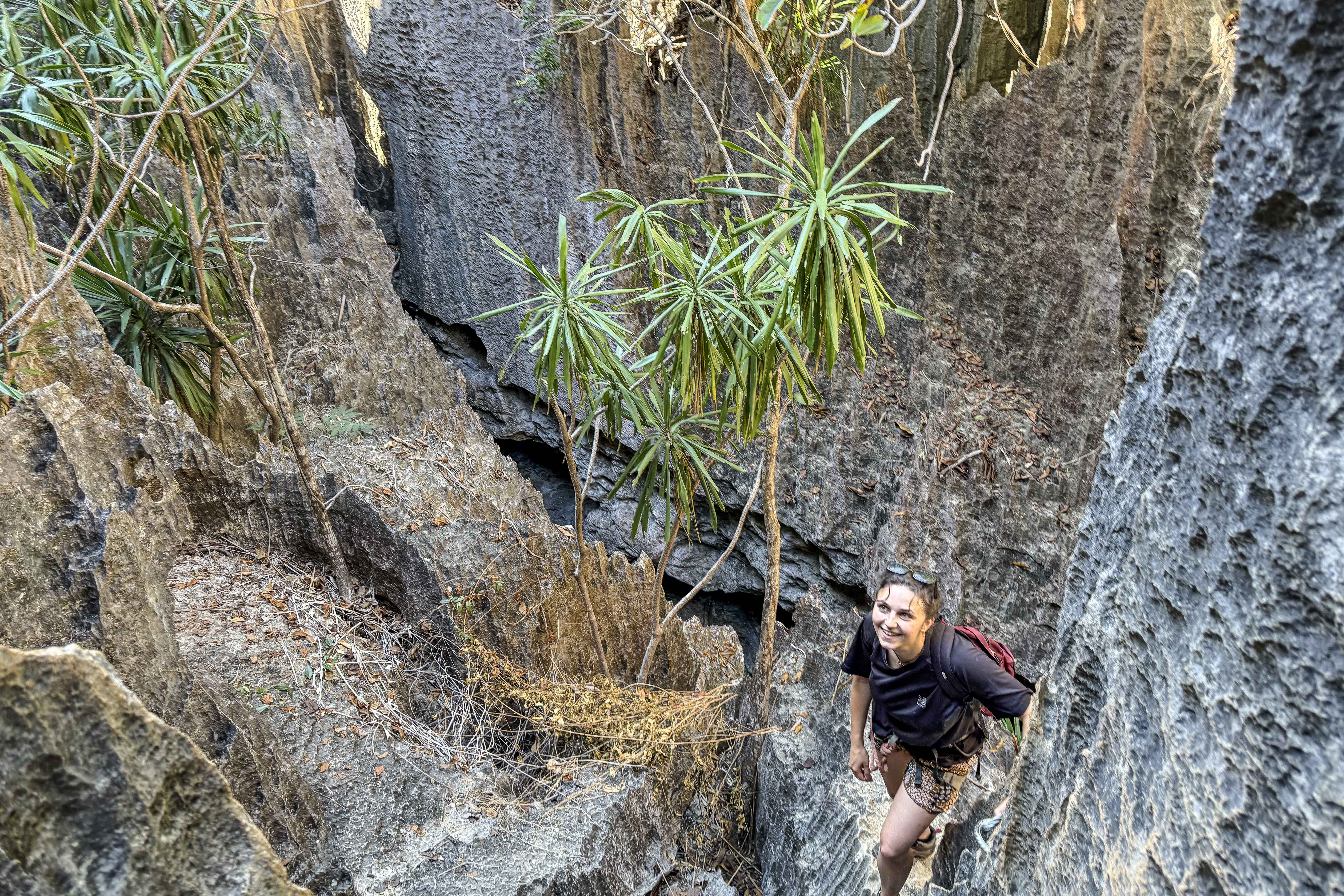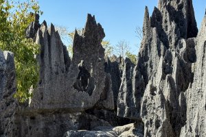 Do wejścia do parku mieliśmy z hotelu 17 km, ale po tamtejszych drogach dojazd zajął nam półtorej godziny. Nieco wytrzęsieni dotarliśmy do miejsca skąd startuje szlak na Grand Tsingy. Tam trzeba było założyć uprzęże i lonże bo czekała nas wspinaczka po stromych skałach, po których poprowadzono ubezpieczony szlak. Szlak rzeczywiście był niesamowity, a widoki z najwyżej dostępnych punktów to kolejne niesamowite przeżycie. W zależności od pory dnia i intensywności słońca mieszają się tu wszystkie odcienie szarości i zieleni. Skały obserwowane z dołu sprawiają wrażenie sięgających do samego nieba gotyckich katedr.